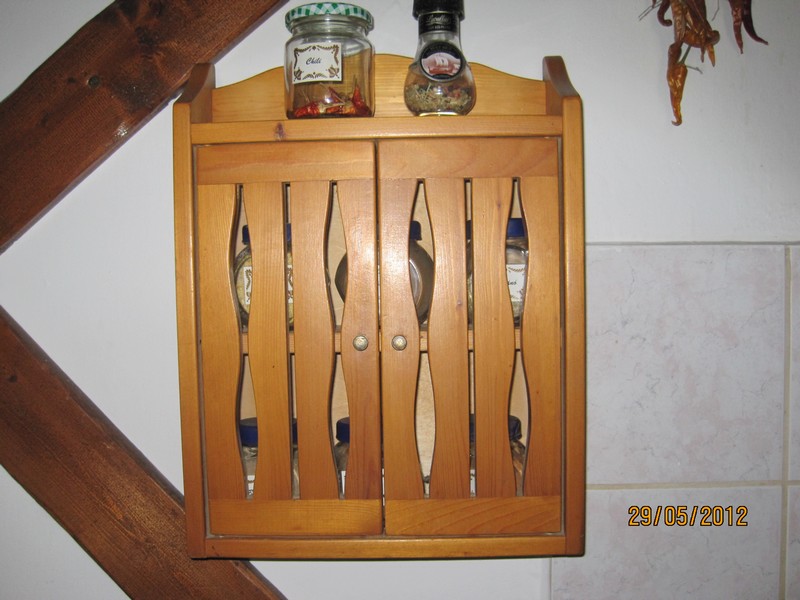 Szép füszertartó szekrénykét készitettél, viszont a füszertartók fedele nem stilusos/ lemez, müanyag/ alkoss rá szép esztergált kalapot fából.A feleséged biztos fogja dijjazni.