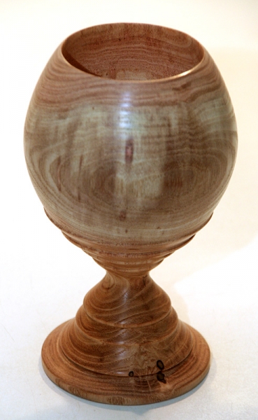 Vastagabb ágdarab, sikerült a szíjácsot a felső rész közepén körbe még éppen megtartani, míg a többi felület a geszt sötétebb színe. A bordázat mintákkal megjártam. Először élesebbre próbáltam, de a durvább szövetű, gyűrűs likacsú fa a nagy edényeivel ezt nem engedte hibamentesen, hanem folyton kipattantak részek keskeny élekből. Így egy hét pihenés után visszatettem a gépbe és az itt látható tompábbra leszabályoztam a korábbi éles "lépcsőperemeket".