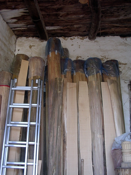 Leendő megmunkálásra árnyékos, hűvös helyre tett hársfa rönkök nejlonzsák bütüvédelemmel.