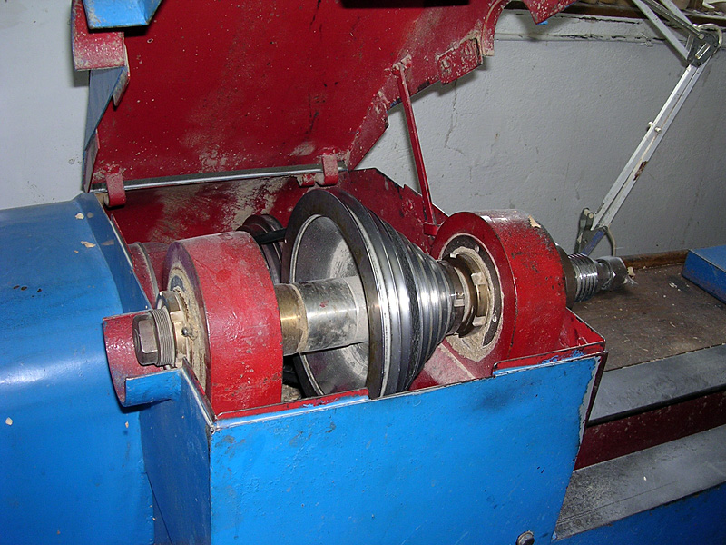 A Pausch műhely negyedik gépének orsóháza. Ez kuplungos gép: a motor forgása közben kinyomható a kuplung, hogy a munkadarab leállítható legyen, de a nagy tehetetlenségű motor had fusson tovább.