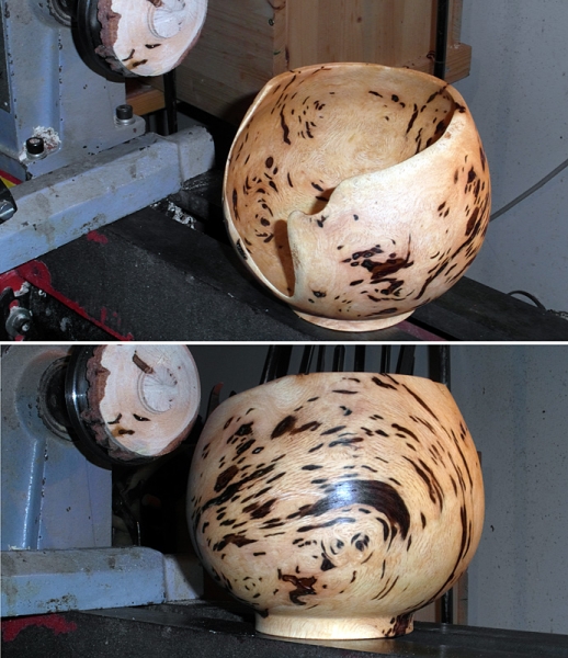 Jancsibá: Örülök, ha elindult a fantáziád, hátha ráakadsz te is egy ilyen alapanyagra. Egyszer próbálkoztam szintén fakitermelésen talált benőtt ágcsonkkal is. Letörik az ág, majd sok év alatt mint sebet benövi a fa. Mikor a fát kivágják, az ilyen kiálló részt lefűrészelik (palástra vágják), s eldobják. Abba szerencsére nem törött bele a késem, de majdnem szikrát hányt, így aztán feladtam. A beszáradt tölgy csonk irgalmatlan kemény volt. Amíg friss, nedves, addig úgy látom: könnyebb elbánni vele.