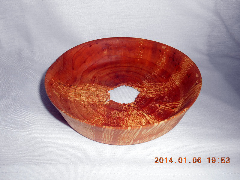 Igaz, ez a darabod nem keresztszálú. Először megcsináltad a belsejét, majd a talpát leszúrással próbáltad? Nos így garantált a képen látható eredmény, ha a fenéken kicsi a falvastagság. A fenékre merőleges szál nekem a hasonló esetekben mindig kiszakadt. Ha csapos (kiálló) talpat, tehát nagyobb talpvastagságot készítesz, azzal elkerülheted ezt a hibát. A másik lehetőség, hogy sík talpat szeretnél, haladsz egyre beljebb a leszúrással, mikor úgy érzed, hogy hamarosan átszakad, akkor megállítod a gépet, kézifűrésszel levágod a fenéktől kicsit messzebb, majd csiszológéppel (pl. flexben gumitányéros csiszolókorong) lecsiszolod a kiálló részt.