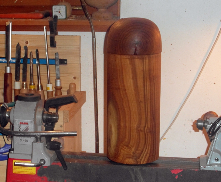 Tehát nemezeléshez való szerszám. D 17 cm, alsó darab magassága: 34 cm. Az oszlop rész olajfűz, a félgömb-szerű teteje: mandula. (Utóbbi tálak repedt volt, ez lett belőle.)
