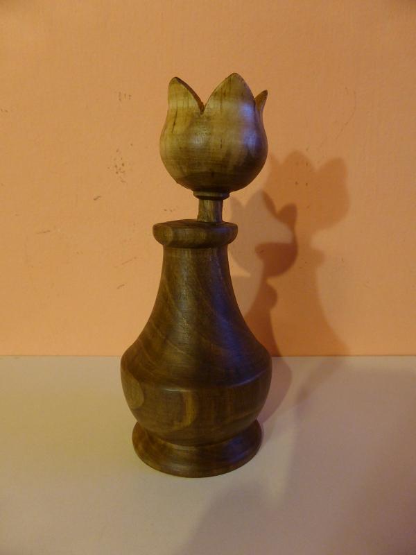 Diófa váza ferde virággal, egyben esztergálva. H:140; D:60 mm. Füstölve, olajozva, viaszolva.
