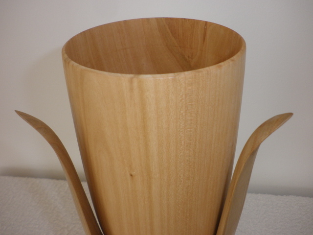 Szivarfa szirmok közé illesztett erdei cseresznyefa váza D=145 H=293 mm Natúr olajozva