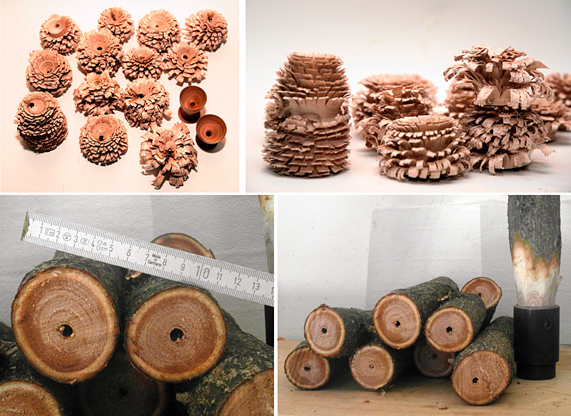 Ez a szöveg hozzá: Kertünk császárfájának koronáját kicsit megigazítottam, amiből ilyen D6cm darabok is adódtak. Kíváncsi voltam milyen megmunkálni ezt a fát. Nagyon könnyű, laza, durva rostú fa. Közepén óriási lukas béllel. Próbáltam két kis poharat készíteni, de nem az igazi, meg a nagy bél-luk is zavaró az ilyen kis átmérőnél. Így inkább virágokat csináltam, amikre elég hosszú szirmot lehet feltolni. Bohóságból készült egy oda-vissza virág is. Nos, ha faesztergályos alapanyagot keresek, nem biztos, hogy nagyon kapaszkodom majd a császárfa után.