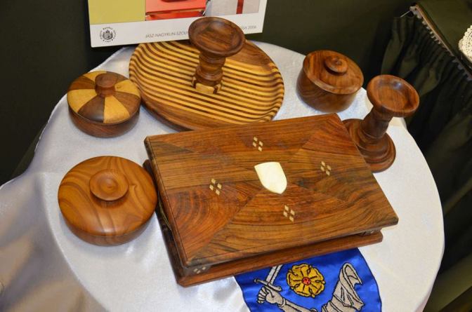 Részlet a kiállításból. Jó érzés, hogy a város címere az alátét, lehet hogy kicsit túlzás? Bár a város ládája van rajta (még akkor is ha én faragtam) és a városkulcs is benne van...