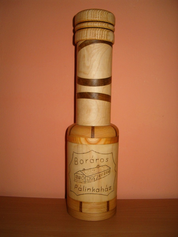 Burkolt pálinkásüveg. H:35,5 cm; D:9cm. Némi bükk, tölgy, nyár, kőris és dió felhasználásával.
