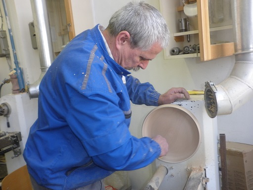 Kosaras Gyuri precízen csiszolja a cseresznye tálat.