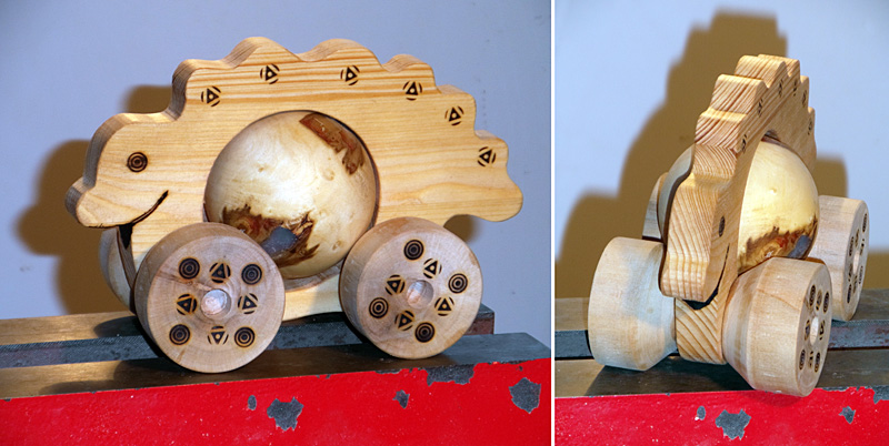 Nem is olyan szörny ű.Az unokád biztosan szépnek látja! (én is).Szép a golyó, direkt jó, hogy foltos! Ha ilyent csinálnék, a golyóhoz úgy illeszteném a kerekeket, hogy a tengelyre csak szárazon tenném fel a kereket, majd szemrevételezés után esztergályoznám a kellő méretre és ezután ragasztanám a tengelyhez a kereket..üdv:fakéz